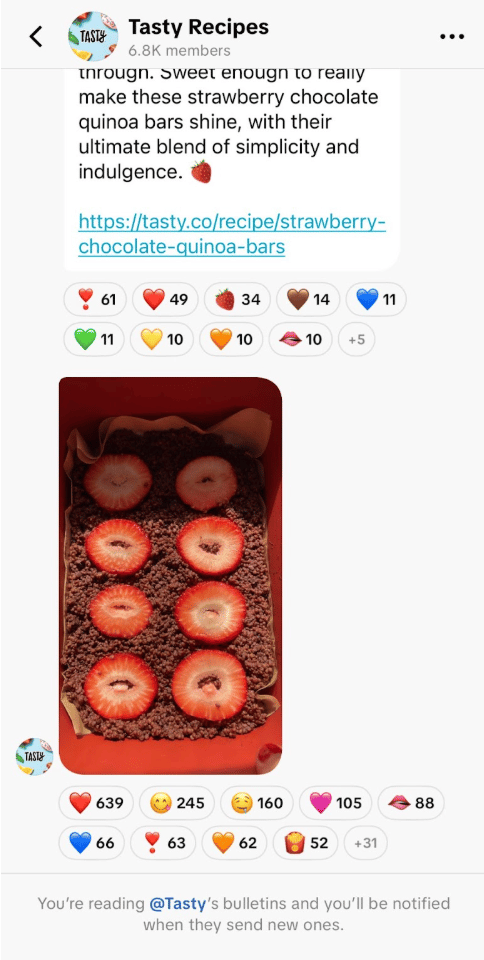 However, every new feature – whether it seems fated for long-term success or not – undeniably presents an opportunity. It’s safe to assume that there’s some kind of algorithmic reward for trying an app’s new features. So people who are hoping on the “bulletin board” trend and, like Tasty, being pro-active about getting people to join their channels may very well see bumps in engagement, followers, etc.